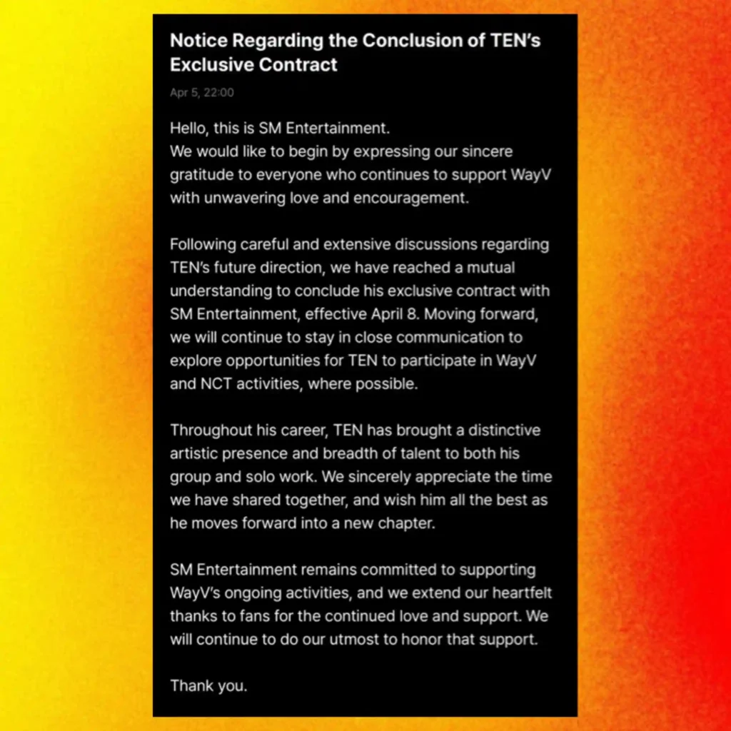 As I approach my 10th anniversary, I have found myself wanting to take on new challenges, explore new possibilities, and discover new versions of myself, so after a lot of thought and many heartfelt discussions with the members and the staff at SM, I have decided to conclude my exclusive contract with the company.” According to the official statement, NCT TEN’s exclusive contract will end on April 8, 2026, and the decision was mutual. As Ten is no longer managed by SM Entertainment, he will still proceed to work with NCT and WayV, but this hybrid arrangement is rarely seen in the K-pop industry.